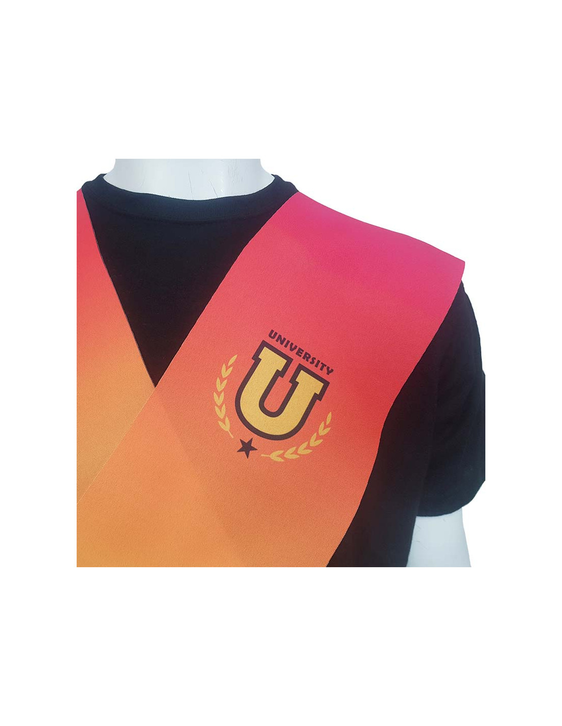 Las bandas de graduación sublimadas son la mejor opción para resaltar el logo o el nombre de la institución educativa. Ofrecemos bandas confeccionadas en tejido Streck de 170g, compuesto íntegramente de poliéster; su acabado puede ser mediante pespunte o corte a láser, ambos métodos evitan que la tela se deshilache.